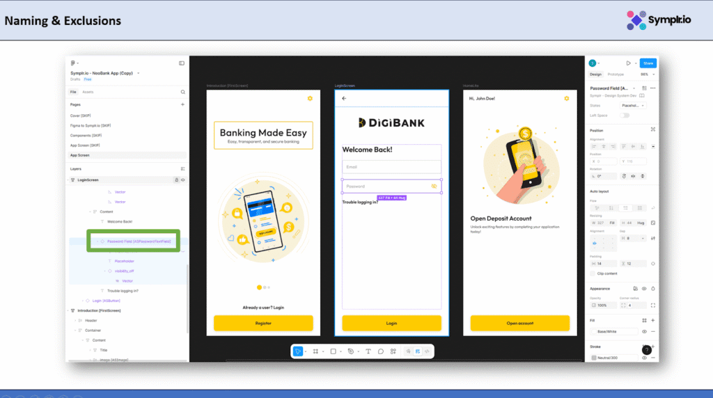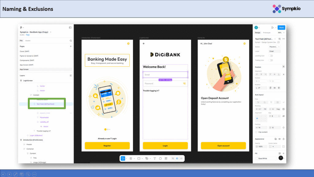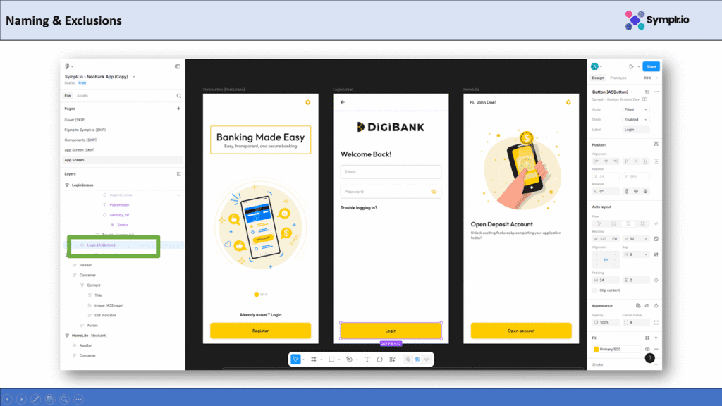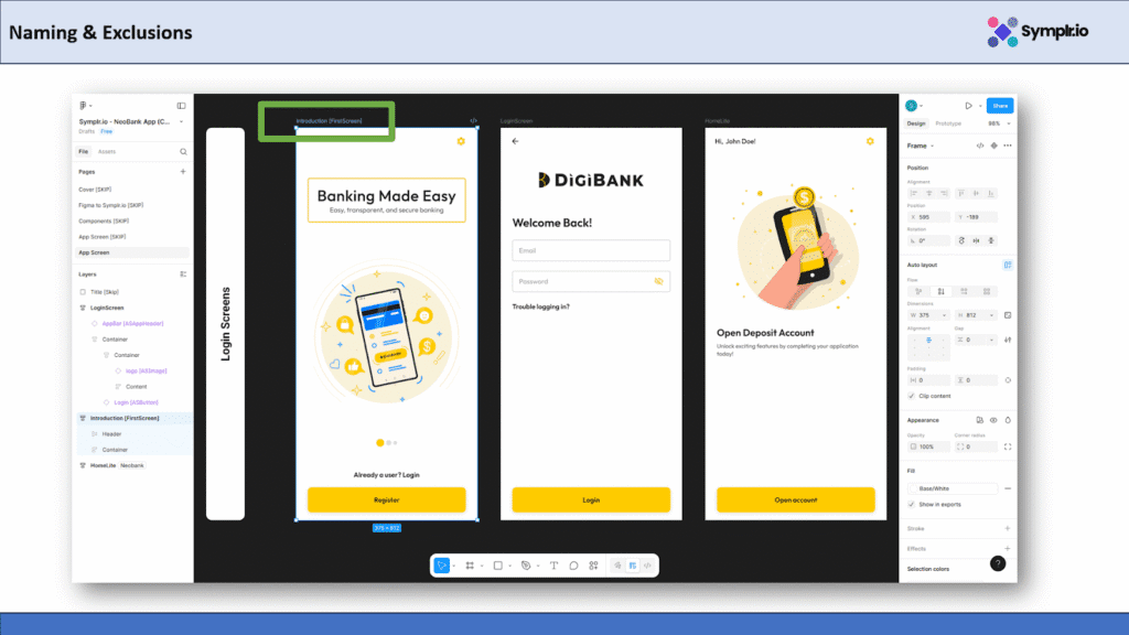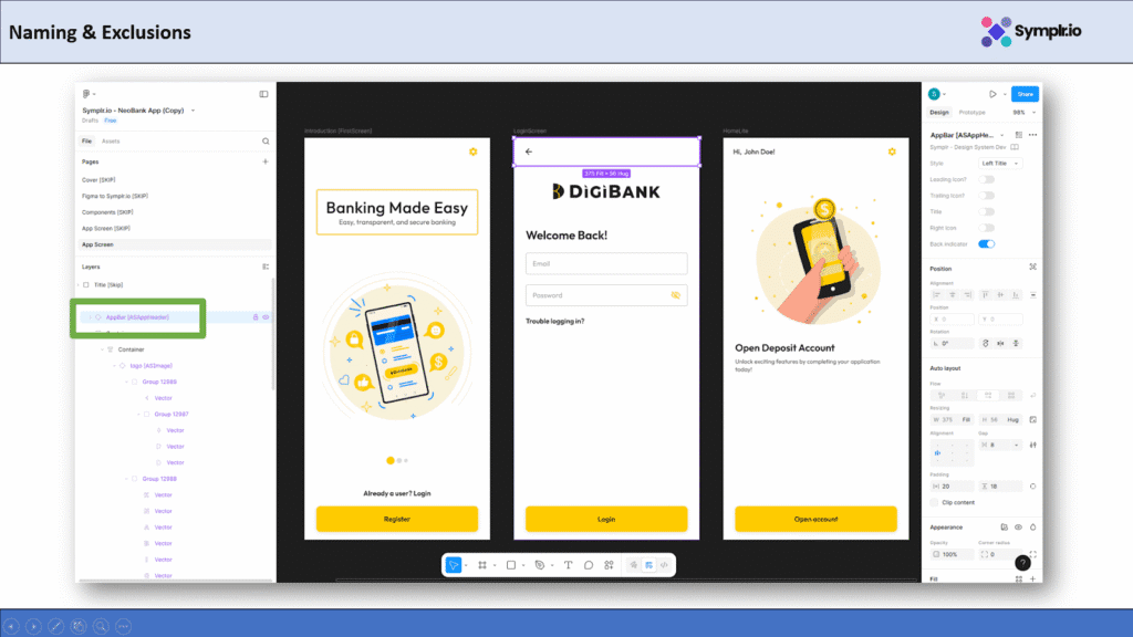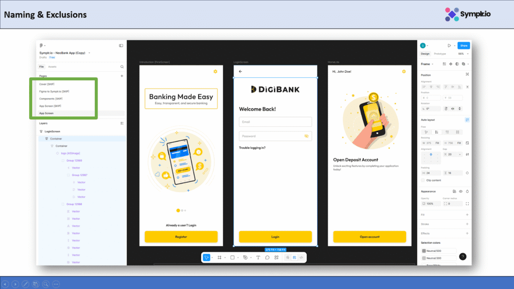 It is very important to make sure that your Figma project is structured correctly before you import your design into Symplr.io. Symplr can correctly recognize layouts, components, and navigation paths when the structure is clean. This keeps imports from breaking layouts or missing screens.In this step, you “teach” Symplr how to read your design.