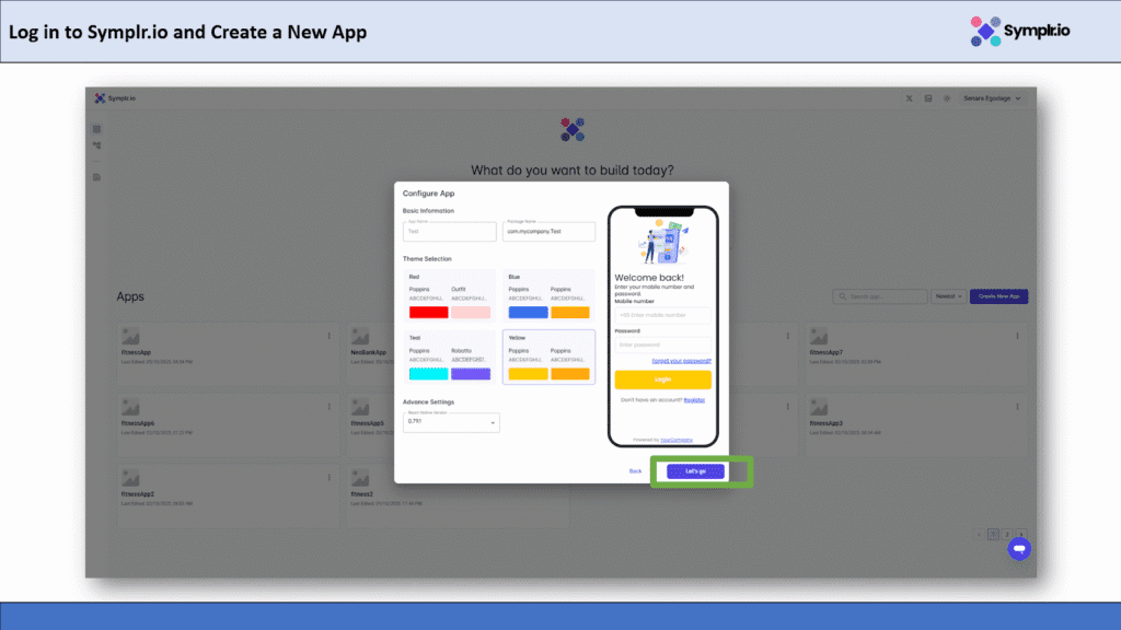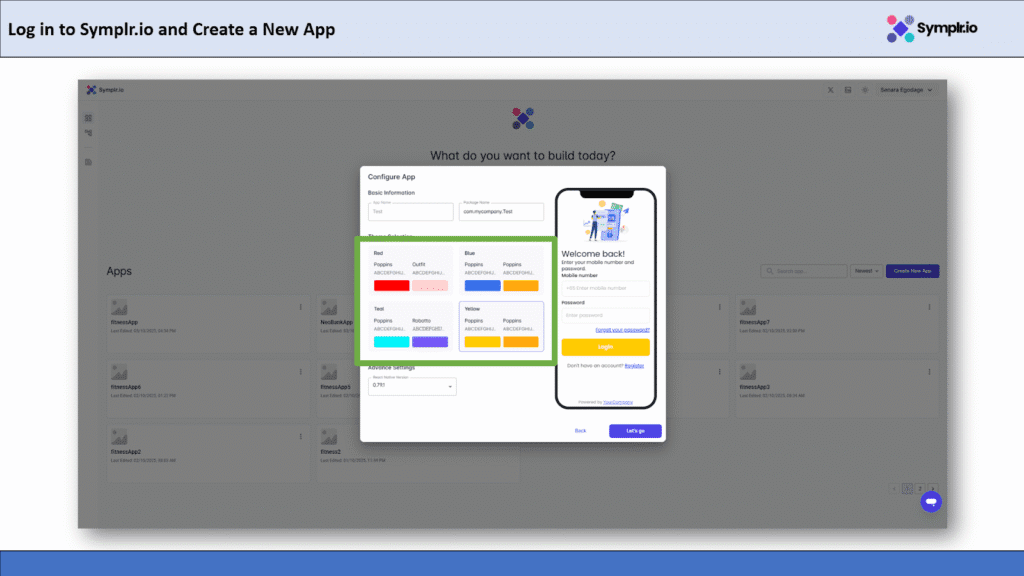 Configure Your App Theme –Choose your preferred color theme and typography combination (Red, Blue, Teal, or Yellow). You can also preview how your app will look on a mobile device.
